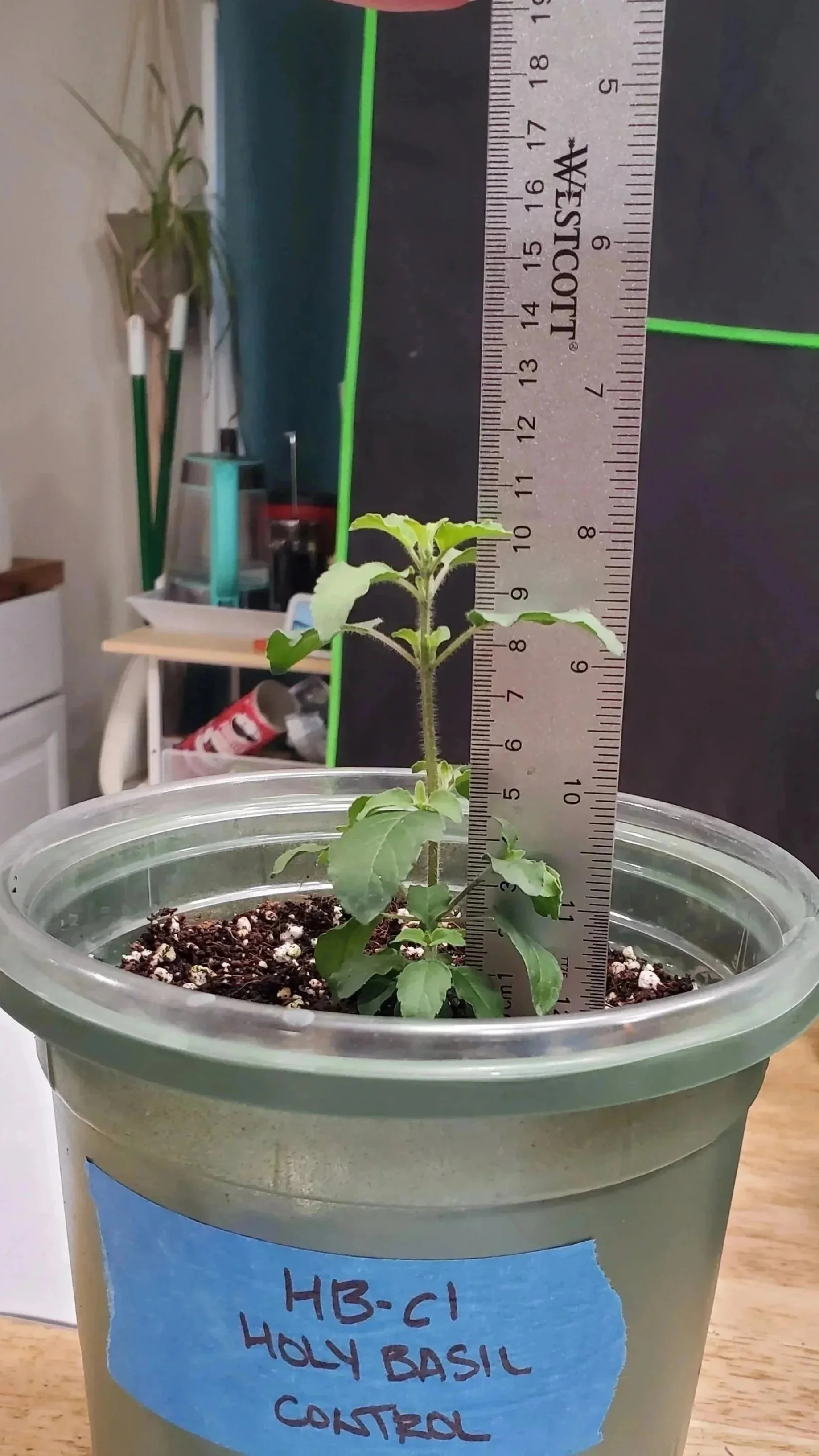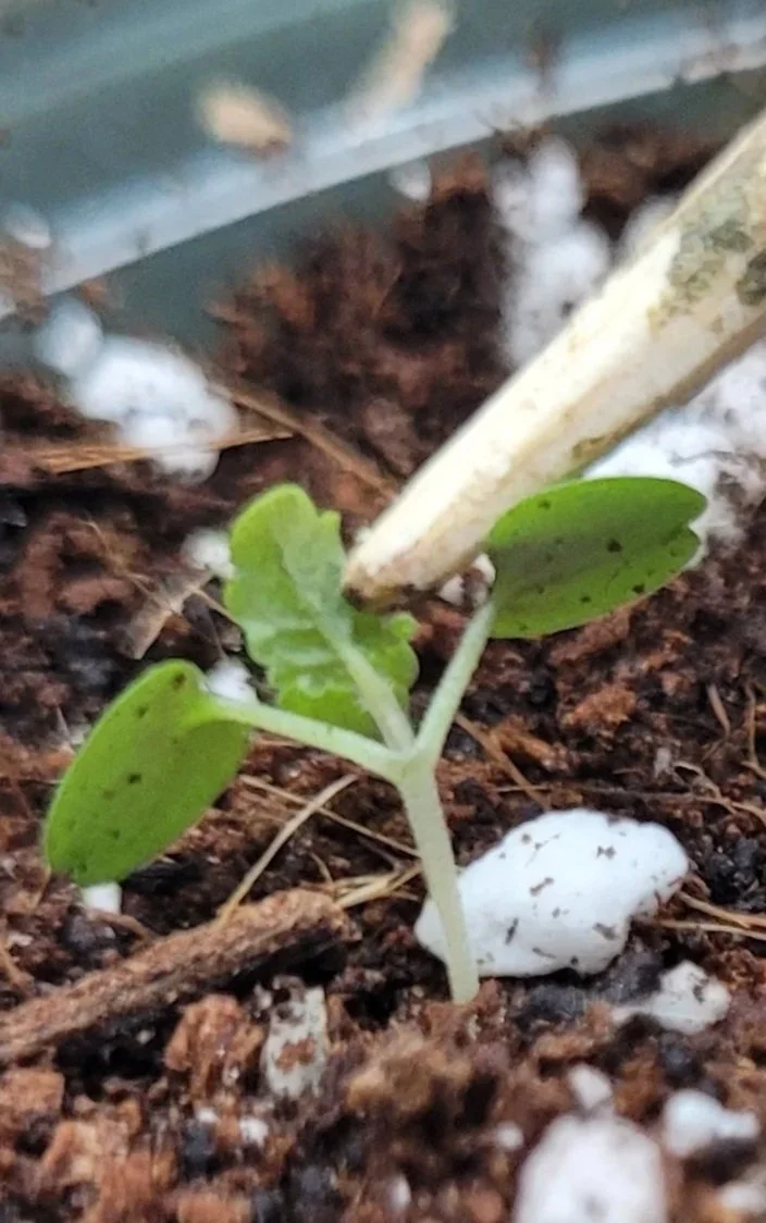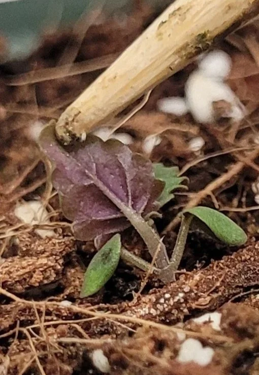 Lemon Balm seedlings from the same packet. The 6 on the left are BCCP-induced “Haivyan Lemon Balm Purple,” with enhanced pigmentation, a sign of increased biochemical production (essential oils), while the 6 on the right are typical controls.