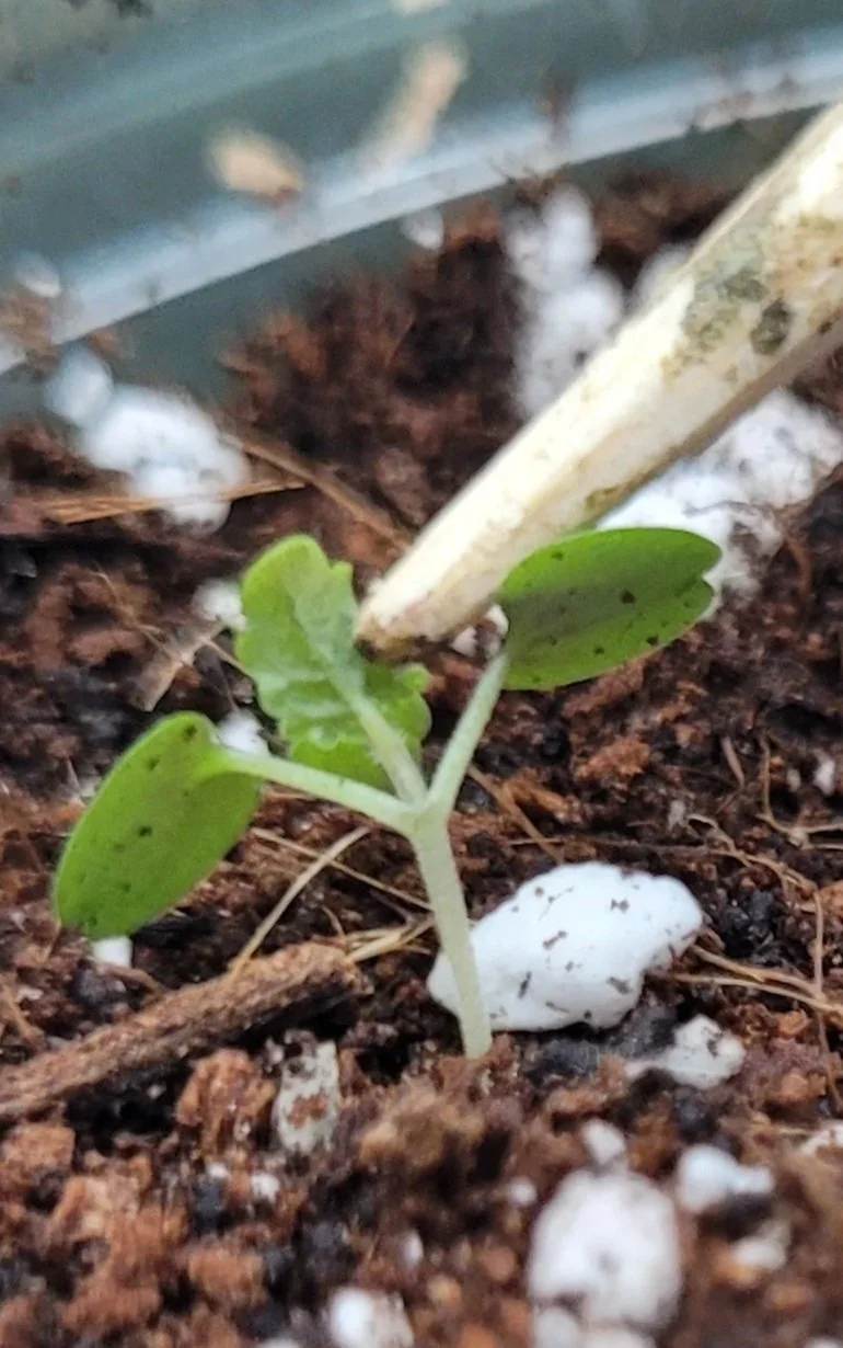 Lemon Balm seedlings from the same packet. The 6 on the left are BCCP-induced “Haivyan Lemon Balm Purple,” with enhanced pigmentation, a sign of increased biochemical production (essential oils), while the 6 on the right are typical controls.